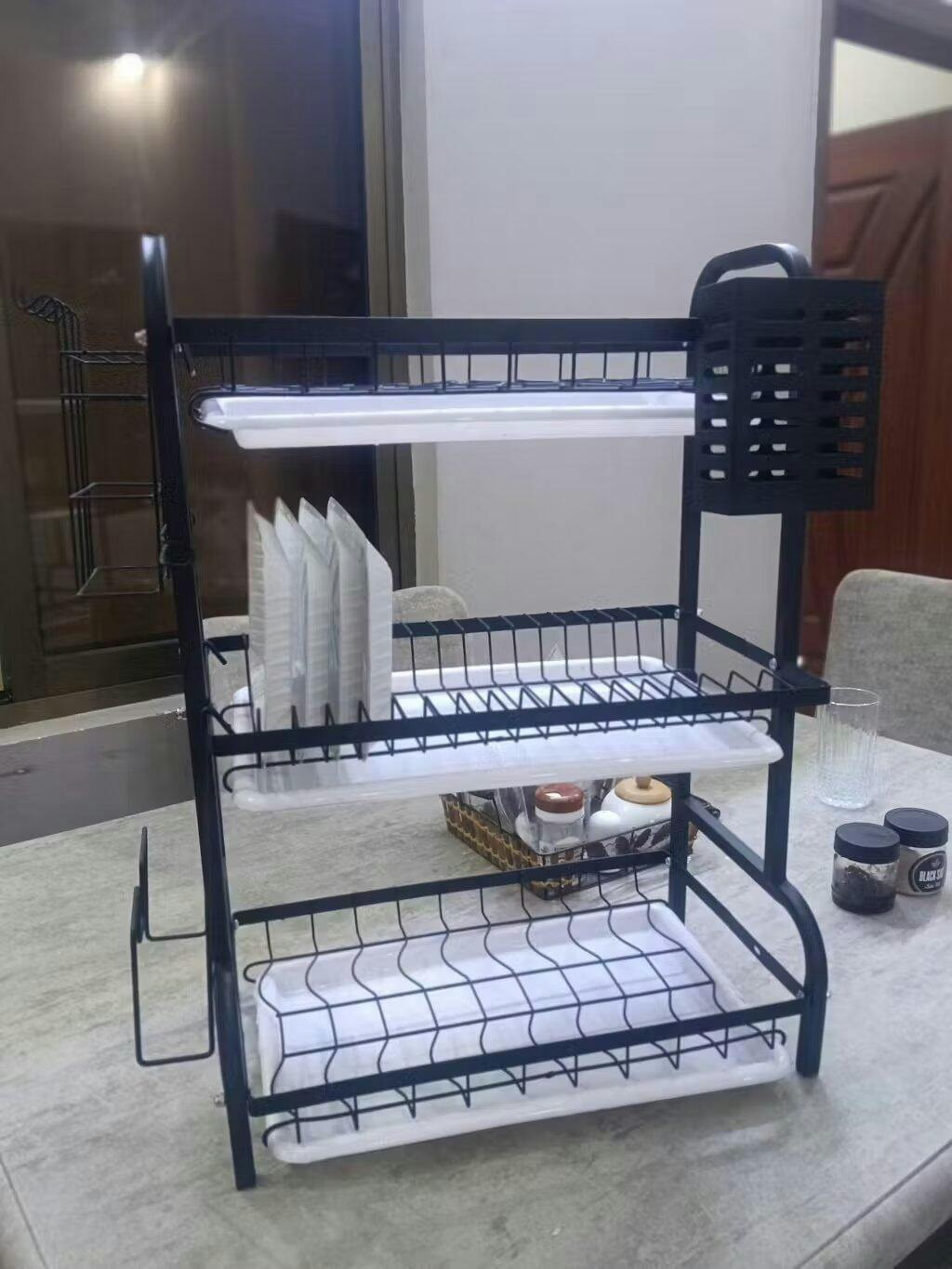 The first tier of the dish drying rack with drainboard can hold dishes, plates, coffee cups, pots, fruits; The second tier can store bowls, pots, bottles, and goblets, spices, ideal for your kitchen countertop. The bottom tier can place any items you need
