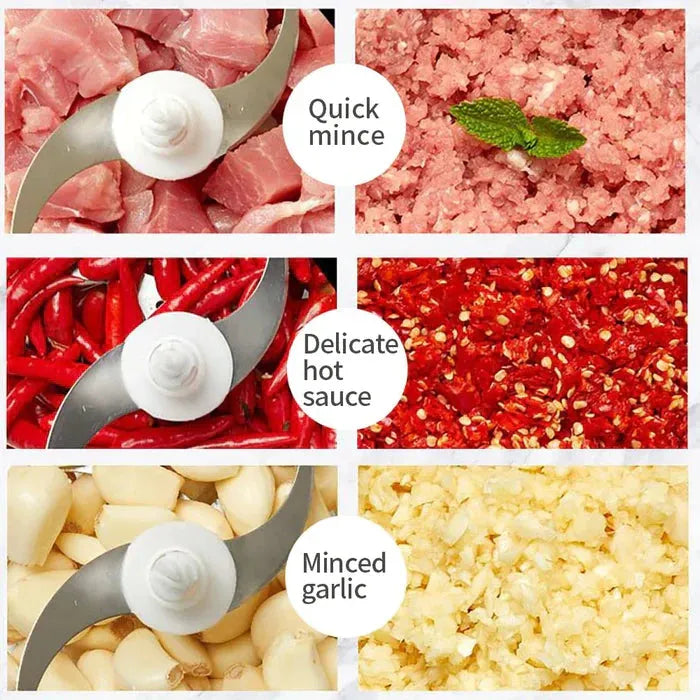 Equipped with interchangeable blades to accommodate various chopping needs, from fine mincing to coarse chopping, providing versatility for different recipes.