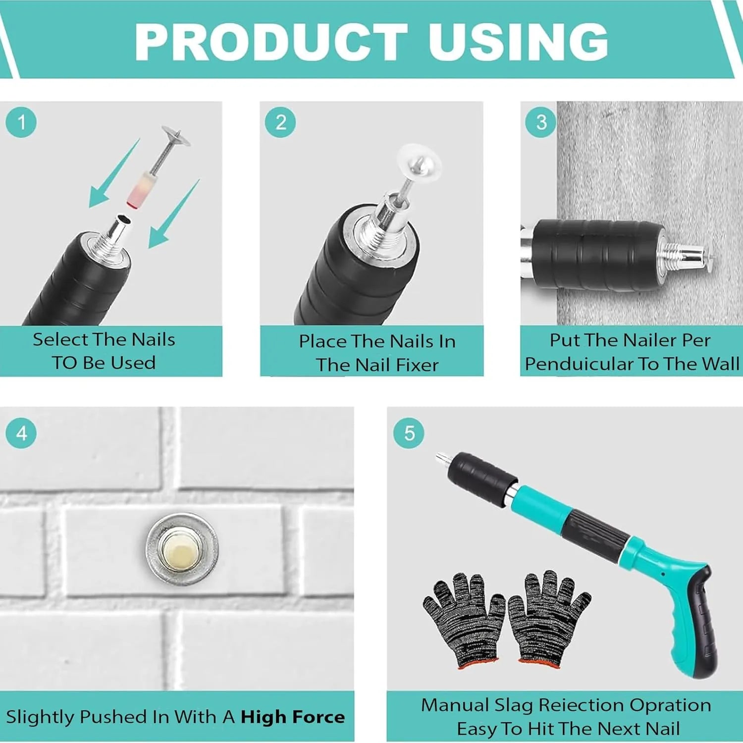 Uses simple manual action — insert a nail, position against the surface, and apply repeated pressure to drive the nail in